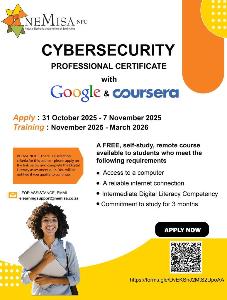 NEMISA is offering a FREE Cybersecurity Professional Certificate in partnership with Google and Coursera. It’s 100% online, self-paced, and designed to help you build real skills you can use immediately whether you’re starting from another discipline or upskilling for your current role.