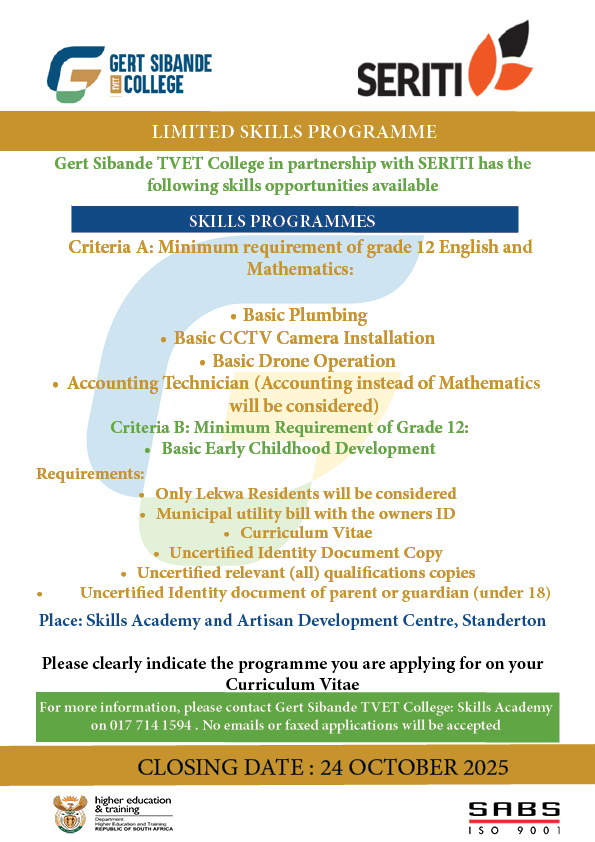 Lekwan youth, here’s your chance to access real-world skills and kickstart your career! Gert Sibande TVET College, in partnership with SERITI, is offering Free Skills Training through five high-demand programmes that equip you with practical, hands-on knowledge employers and clients value.