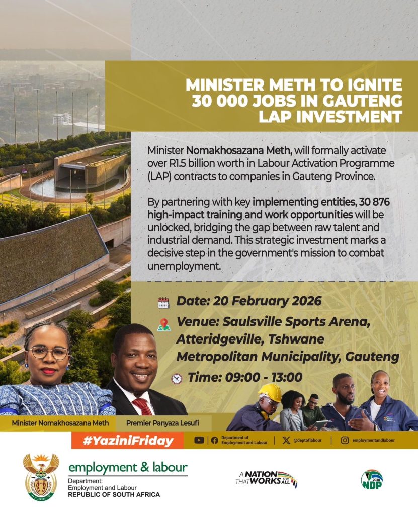 The Minister of Employment and Labour, Nomakhosazana Meth, together with Gauteng Premier Panyaza Lesufi, will on Friday, 20 February 2026, preside over a landmark ceremony to formally activate over R1.5 billion Investment in Labour Activation Programme (LAP) contracts awarded to companies across Gauteng Province.