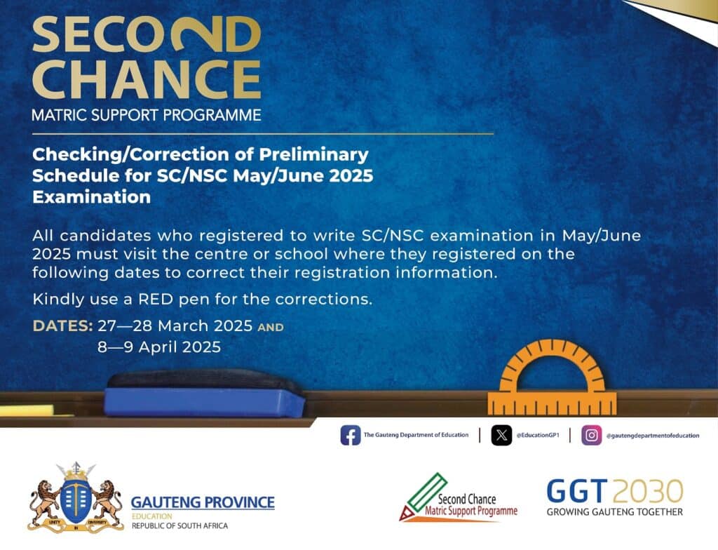 The Second Chance Matric Support Programme is an initiative by the Gauteng Department of Education designed to help Matric students ensure that all their exam details are accurate before the May/June 2025 SC/NSC exams.