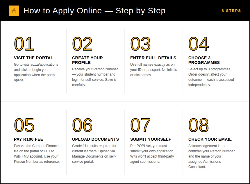 The Wits application process is completed entirely online. Follow these steps carefully: