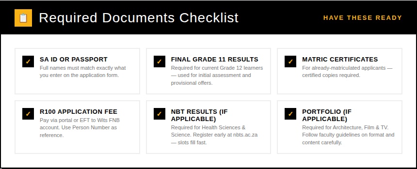 | ☐ | R100 Application Fee Proof | Pay via self-service portal or EFT to Wits FNB account; use your Person Number as reference |
