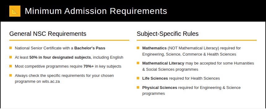 To apply to Wits, you must have — or be working towards — a National Senior Certificate (NSC) with a Bachelor’s pass. This means achieving at least 50% in four designated subjects, including English.